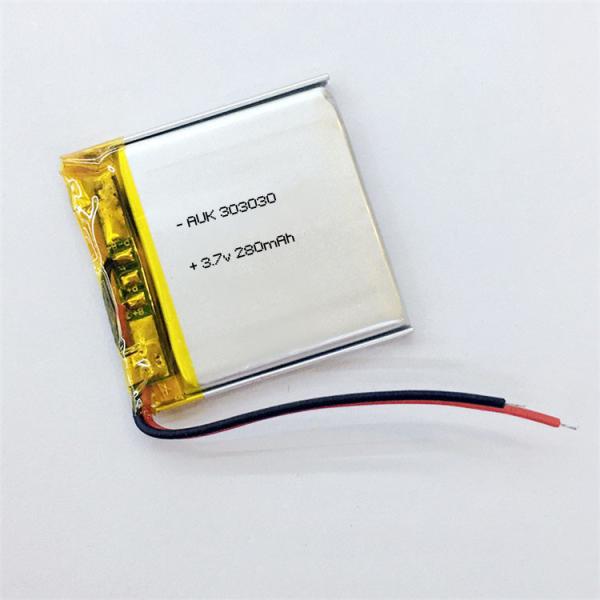 Lithium Polymer Battery AUK 303030 rated voltage is 3.7V, charging Voltage 4.2V, rated capacity is 280mAh;